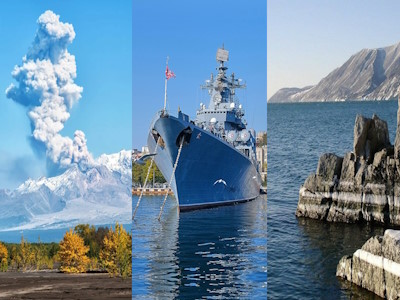 Рельеф определяют вулканические хребты (Срединный и Восточный на Камчатке), Корякское нагорье и отдельные вулканические массивы на Курилах. Высшая точка — действующий вулкан Ключевская Сопка (около 4750 м) — один из высочайших действующих вулканов Евразии. Здесь более 300 вулканов, из которых около 90 действующих. Долина гейзеров на Камчатке — уникальное термальное поле с десятками горячих источников и гейзеров. Климат суровый, муссонный на юге и арктический на севере. Растительность — от каменноберёзовых лесов (из берёзы Эрмана) и кедрового стланика до горных тундр. Фауна: бурый медведь (камчатская популяция — одна из крупнейших), снежный баран, северный олень, соболь, лисица, калан (морская выдра) на Командорах, лежбища сивучей и моржей. На побережьях — птичьи базары (кайры, топорки, ипатки). В омывающих морях — киты, косатки, нерпы.